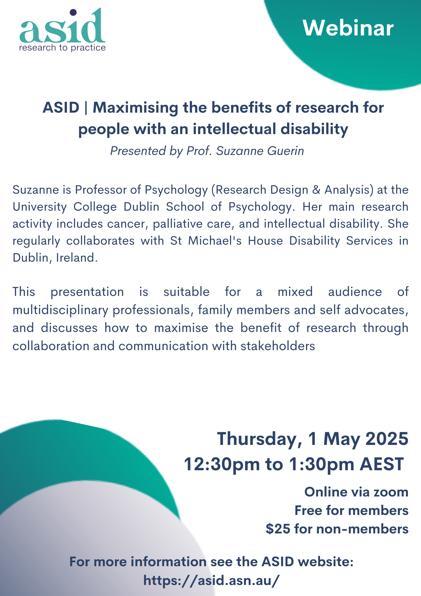 This presentation is suitable for a mixed audience of multidisciplinary professionals, family members and self advocates, and discusses how to maximise the benefit of research through collaboration and communication with stakeholders